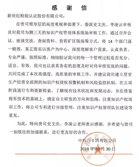 四O四對認證審核工作高度重視、積極配合,順利通過知識產(chǎn)權管理體系的認證審核,證書認證范圍是:與核燃料的加工,核設施退役相關的知識產(chǎn)權管理。在征得公司同意之后,BCC將四O四作為優(yōu)秀貫標案例向國家知識產(chǎn)權局進行了推薦。