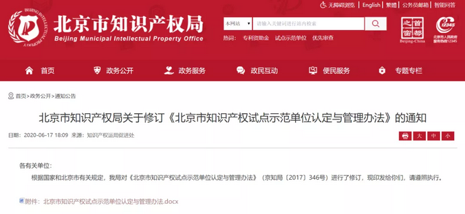 6月17日,為深化實(shí)施創(chuàng)新驅(qū)動戰(zhàn)略和首都知識產(chǎn)權(quán)戰(zhàn)略,進(jìn)一步規(guī)范知識產(chǎn)權(quán)試點(diǎn)示范單位認(rèn)定與管理工作,北京市知識產(chǎn)權(quán)局修訂的《北京市知識產(chǎn)權(quán)試點(diǎn)示范單位認(rèn)定與管理辦法》(京知局〔2020〕171號)正式發(fā)布。