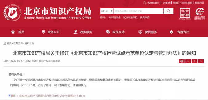 同日,為培育一批知識產(chǎn)權(quán)運(yùn)營能力強(qiáng)、成效好、具有示范效應(yīng)的知識產(chǎn)權(quán)運(yùn)營機(jī)構(gòu),發(fā)揮其在北京市知識產(chǎn)權(quán)運(yùn)營體系建設(shè)工作中的支撐作用,促進(jìn)北京市知識產(chǎn)權(quán)運(yùn)營市場發(fā)展,加快全國科技創(chuàng)新中心和知識產(chǎn)權(quán)首善之區(qū)建設(shè),北京市知識產(chǎn)權(quán)局修訂并發(fā)布《北京市知識產(chǎn)權(quán)運(yùn)營試點(diǎn)示范單位認(rèn)定與管理辦法》(京知局〔2020〕172號)。