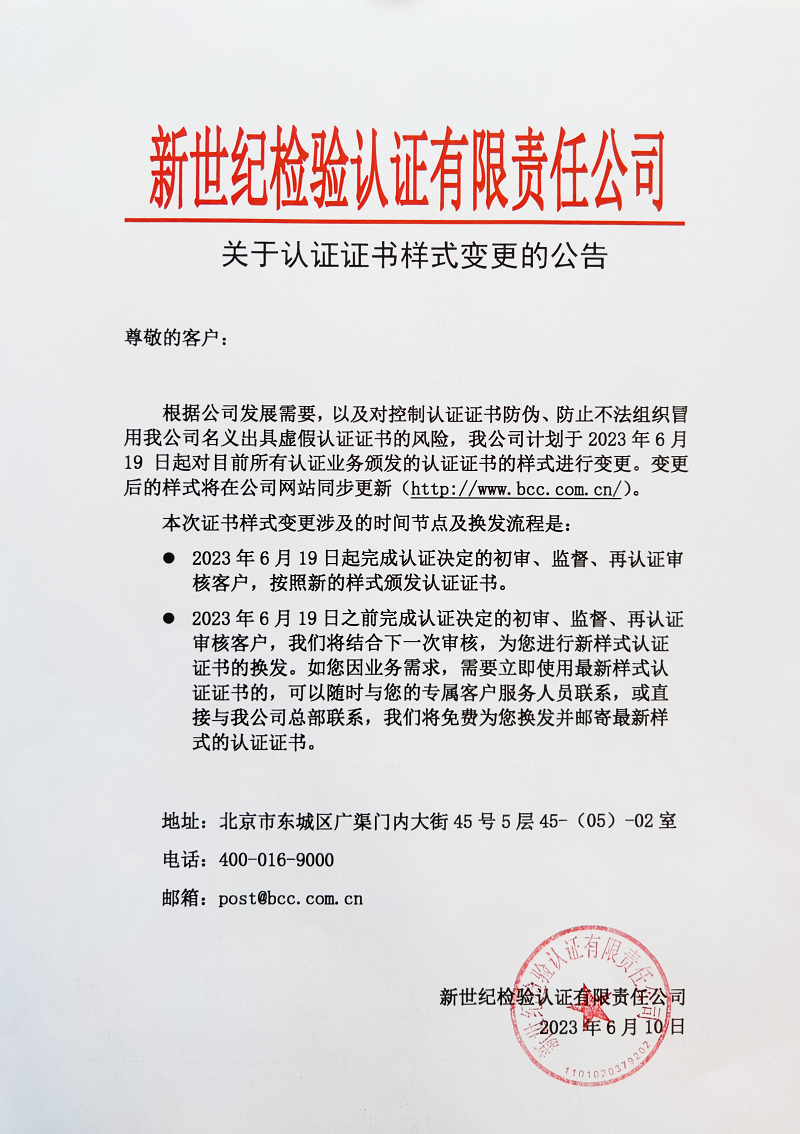 關(guān)于認(rèn)證證書(shū)樣式變更的公告