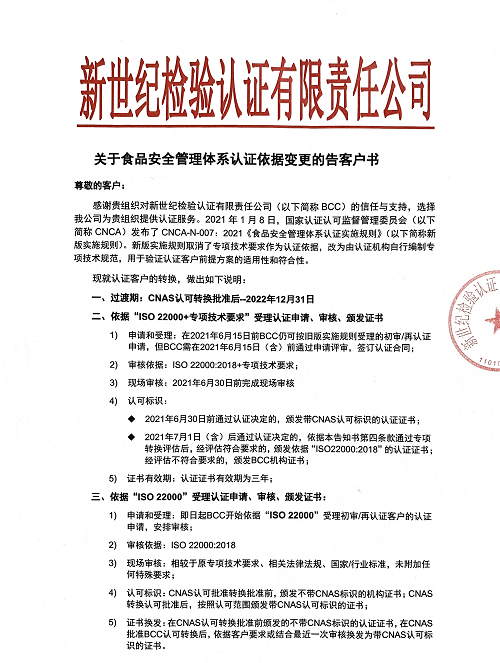感謝貴組織對新世紀檢驗認證有限責任公司(以下簡稱BCC)的信任與支持,選擇我公司為貴組織提供認證服務。2021年1月8日,國家認證認可監(jiān)督管理委員會(以下簡稱CNCA)發(fā)布了CNCA-N-007:2021《食品安全管理體系認證實施規(guī)則》(以下簡稱新版實施規(guī)則)。新版實施規(guī)則取消了專項技術要求作為認證依據,改為由認證機構自行編制專項技術規(guī)范,用于驗證認證客戶前提方案的適用性和符合性。