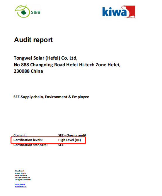 作為全球認(rèn)證領(lǐng)域20強(qiáng)企業(yè),Kiwa集團(tuán)專家與Kiwa BCC專家對(duì)企業(yè)進(jìn)行了現(xiàn)場(chǎng)審核、通過(guò)員工訪談,以及文件評(píng)審等工作,最終為通威太陽(yáng)能頒發(fā)了首份依據(jù)SEE標(biāo)準(zhǔn)的ESG現(xiàn)場(chǎng)評(píng)估報(bào)告,并高度評(píng)價(jià)了通威太陽(yáng)能在ESG管理方面的突出表現(xiàn)。報(bào)告涵蓋可持續(xù)的企業(yè)治理、供應(yīng)鏈管理、員工權(quán)益、環(huán)境管理四個(gè)部分,總計(jì)約50個(gè)主題,在全球范圍內(nèi)有著較高且廣泛的客戶接受度和權(quán)威公信力。